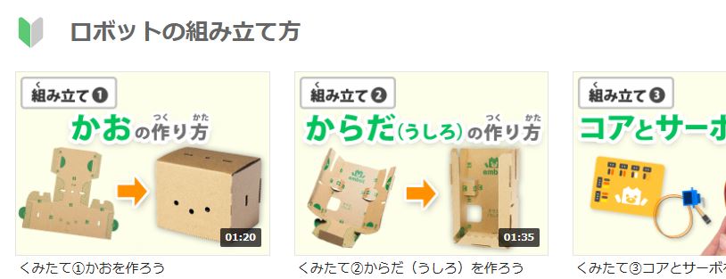 「ロボットの組み立て方」が、順番に10個の動画で丁寧に説明されています。